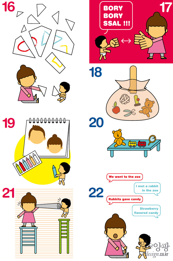 ★ 아이의 언어뿐 아니라 상상력을 자극하는 놀이. “기린이 방귀를 뿡 뀌었어요. 동물원에서 외계인을 만났어요” 등 엄마의 기준에서 아이가 엉뚱한 이야기를 만들어도 절대 이야기를 수정하거나 타박하지 말 것. 아이의 무한한 상상력을 제한할 수 있다는 것을 명심하자.