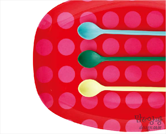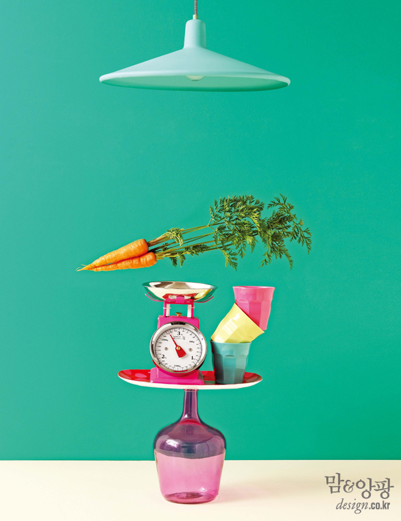터키 블루 색상 팬턴트는 코램프, 핑크색 저울과 꽃병은 윔지, 파스텔 색상의 멜라민 컵과 트레이는 라이스 by 디밤비 제품.