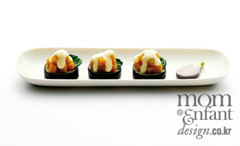 4 ①에 ②와 ③을 넣어 한입 크기로 말고 소스를 곁들인다.