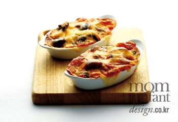 7 그라탱 용기에 버터를 바르고 ①, ⑥, ④ 순으로 담고 모차렐라 치즈와 슬라이스 치즈를 올린 다음 200℃로 예열한 오븐에 넣고 20분 정도 굽는다.