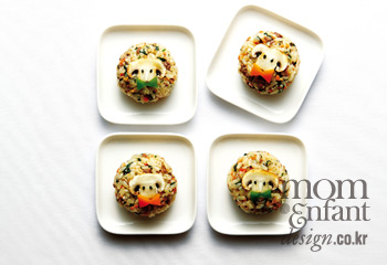 4 밥에 위의 재료를 넣고 잘 섞어 둥글게 뭉쳐 양송이버섯으로 장식한다.