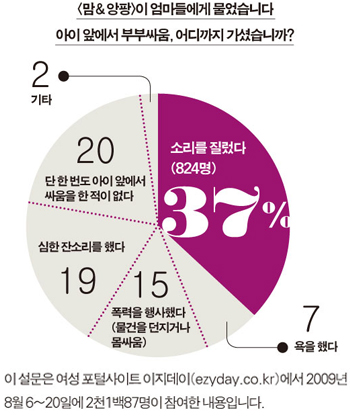 같이 살려니까 싸우지, 헤어지려면 왜 싸우느냐’라는 말이 있을 정도로 부부싸움은 자연스러운 일이다. 서로 다른 환경에서 자란 사람들이 어느 날부터 한집에 사는 데 다툼이 없다면 이상한 일 아닌가. 싸울 땐 곧 끝낼 것처럼 이를 갈아도 웬만한 일이 아니면 함께 부대끼고 살다 보면 상처는 어루만져지고, 보듬어진다. 문제는 엄마 아빠가 싸우는 것을 본 아이가 갖게 되는 불안감과 충격이다.