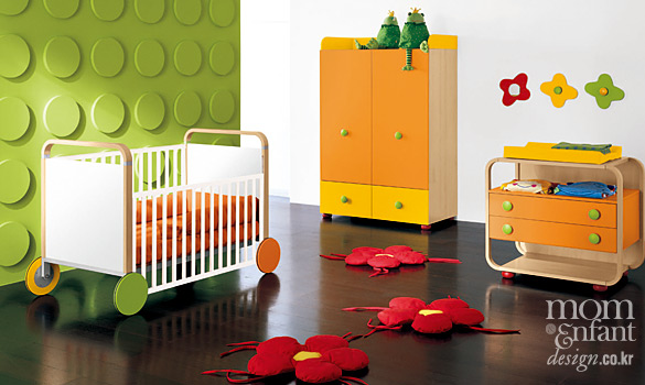 주니어 베드로 변신하는 아기 침대 이탈리아에서 직수입한 제품으로 아이의 심리 발달을 고려한 컬러 사용과 세련된 디자인이 눈에 띈다. 모든 모서리를 둥글게 처리해 안전하고 가드의 높이와 빗살 간격은 안전 기준에 맞춘 국제 표준 규격이다. 아이가 성장하는데 따라 별도의 부품을 구입하지 않고도 주니어 베드로 변형해 사용할 수 있으며 양쪽의 가드는 벽에 걸어 선반으로 사용할 수 있다. 따띠.