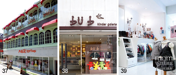독일어로 ‘소년’을 뜻하는 ‘ büb 킨더갤러리’는 최근에 오픈했으며, 기존 국내에서 만날 수 없던 일구포, 미스 블루마린, 끌로에, 몽클레어, 시모네따, 모스키노 등 톱브랜드들을 한자리에서 쇼핑하는 즐거움을 누릴 수 있다. 문의 02-542-8154