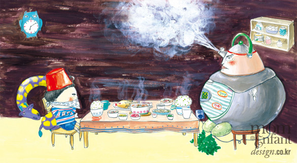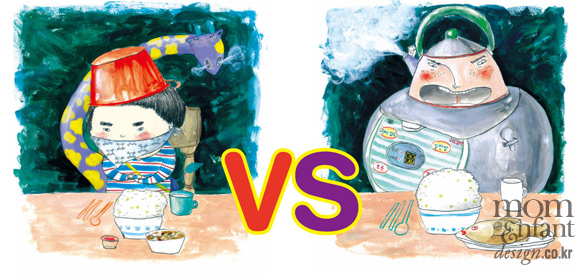 일러스트는 엄마와 아이가 밥상을 사이에 두고 벌이는 ‘전쟁’을 아이의 상상력으로 유쾌하게 풀어낸