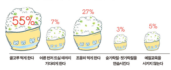 하지만 우리 아이들을 생각해보자. 엄마 아빠 어릴 때와는 많이 다르지 않은지. 어른이 숟가락을 들 때까지 얌전히 기다리게 하기는커녕 한 숟가락이라도 더 먹이려고 돌아다니는 아이를 쫓아다니거나, 좋아하는 TV 프로그램에 정신이 팔려 있을 때 아이 입을 벌려 숟가락을 집어넣지는 않는지. <맘&앙팡>이 독자들을 대상으로 설문조사한 결과, ‘어려서 아직 예절교육을 시키지 않는다’는 응답이 5%에 불과한 것을 보면, 많은 부모들이 밥상머리 예절교육의 중요성을 인식하고 있는 것 같다. 그럼에도 매일같이 밥상머리에서 ‘전쟁’이 벌어지는 이유는 제대로 습관을 들이지 못해서, 즉 그 방법을 몰라서가 아닐까. 이에 아이에게 밥상머리에서 지켜야 할 기본 예절을 습관 들이는 방법을 제안한다.