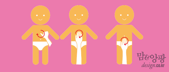 1 아이를 눕힌 뒤 가슴과 가슴 사이 명치뼈와 배꼽 사이의 중간 지점을 엄지와 손바닥으로 번갈아가며 동그랗게 문지른다. 위장을 자극해 소화기를 튼튼히 한다.