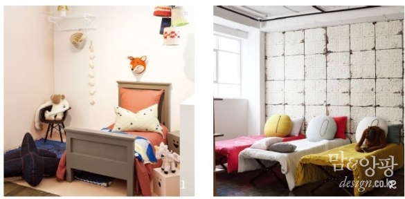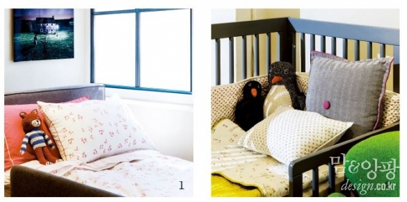 2 형제자매가 함께 잠자는 방을 꾸밀 때도 색채의 변화로 재미를 더할 수 있다. 이불과 베개 커버의 색을 서로 다르게 해 체 세팅의 완성도를 높였다.
