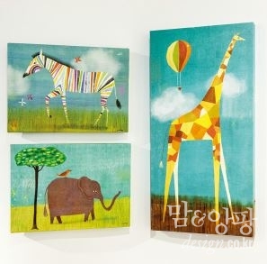 굳이 큰 비용을 들이지 않아도 아이 방 벽을 예쁘게 꾸밀 수 있는 방법은 얼마든지 있다. 아이가 직접 그린 그림들을 모아 붙이거나 아이가 보지 않는 그림책의 예쁜 페이지를 오려 붙여도 된다. 요즘은 아이들이 좋아하는 예쁜 일러스트의 포스터가 많이 출시되어 저렴한 비용으로 멋진 그림을 걸어둘 수 있다. 얼룩말•코끼리•기린을 알록달록한 색으로 표현한 캔버스 액자는 웁시데이지.