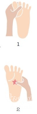 발바닥 앞쪽의 주름이 나뉘는 부분을 엄지손가락으로 살살 문지르듯 눌러준다. 온 몸의 기운을 맑게 하여 두통 및 입덧을 완화하는 효과가 있다.