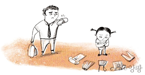 간혹 쓸데없는 고집을 피워 열을 받게 한다. 신은 양말이 마음에 들지 않는다느니, 어제 입은 티셔츠는 입기 싫다느니 하며 군소리가 이어진다. 간혹 쓸데없는 고집을 피워 열을 받게 한다. 신은 양말이 마음에 들지 않는다느니, 어제 입은 티셔츠는 입기 싫다느니 하며 군소리가 이어진다. 어린이집 등원하는 버스 시간에 쫓겨 마음이 급한데 아이의 고집 따위를 받아줄 여유는 없다. “내일은 마음에 드는 양말 신고, 티셔츠 입자”고 달래보지만 울면서 떼를 쓰면 특효약을 써야 한다. 무서운 얼굴 표정으로 두 눈을 부릅뜨고 아이에게 말한다. “조용해. 오늘은 그냥 가!” 여기서 끝이 아니다. 내가 시동도 걸기 전에 조수석에 자리를 잡은 아이에게 “앞자리는 위험해서 안 돼. 뒤로 가서 앉으세요”라고 부드러운 목소리로 달래본다. “오늘은 앞에 앉고 싶어”라며 한사코 고집을 피우면 결국 목소리를 높여야 한다. “고집 피우지 말고 뒤로 가서 앉아!” 고백하자면 간혹 있는 일이 아니다. 꽤 자주, 꽤나 자주 있는 일이다.